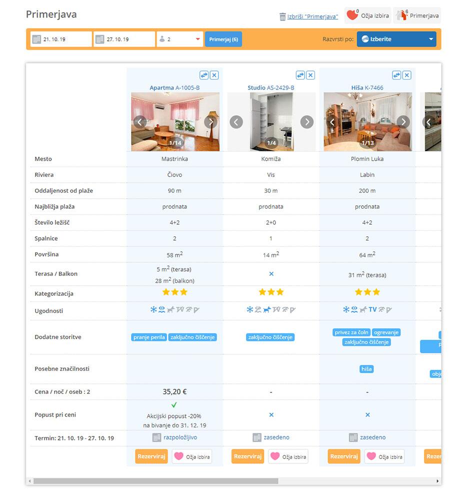 Namestitveno enoto, ki vam najbolj ustreza, lahko rezervirate že na strani Primerjava namestitev, s klikom na gumb "Rezerviraj". Lahko jo shranite v Priljubljene.
